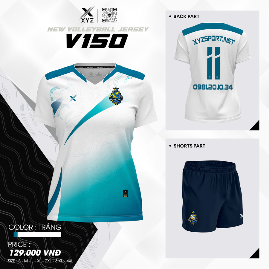 Áo bóng chuyền V150 trắng phối xanh – thiết kế hiện đại, tinh tế và đậm chất thể thao dành riêng cho những tín đồ bóng chuyền yêu sự sáng tạo và khác biệt!