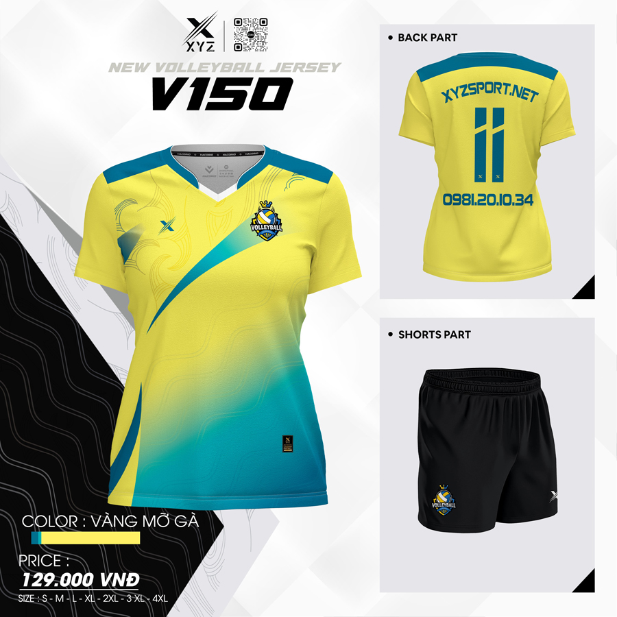 Khám phá áo bóng chuyền V150 màu vàng mỡ gà phối xanh ngọc lam – thiết kế trẻ trung, chất liệu thể thao cao cấp, thoáng mát, co giãn tốt, lý tưởng cho vận động mạnh và thi đấu chuyên nghiệp.