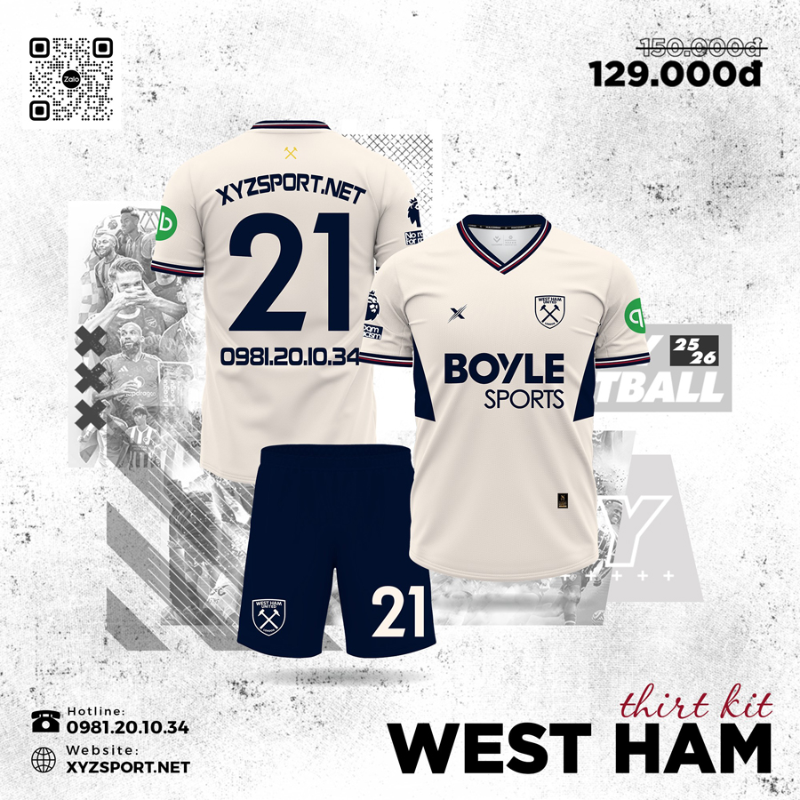Áo đấu West Ham phiên bản Third mùa giải 2025/26 mang tông màu kem mới lạ, kết hợp chi tiết navy mạnh mẽ, là lựa chọn lý tưởng cho cả fan hâm mộ lẫn tín đồ thời trang thể thao.