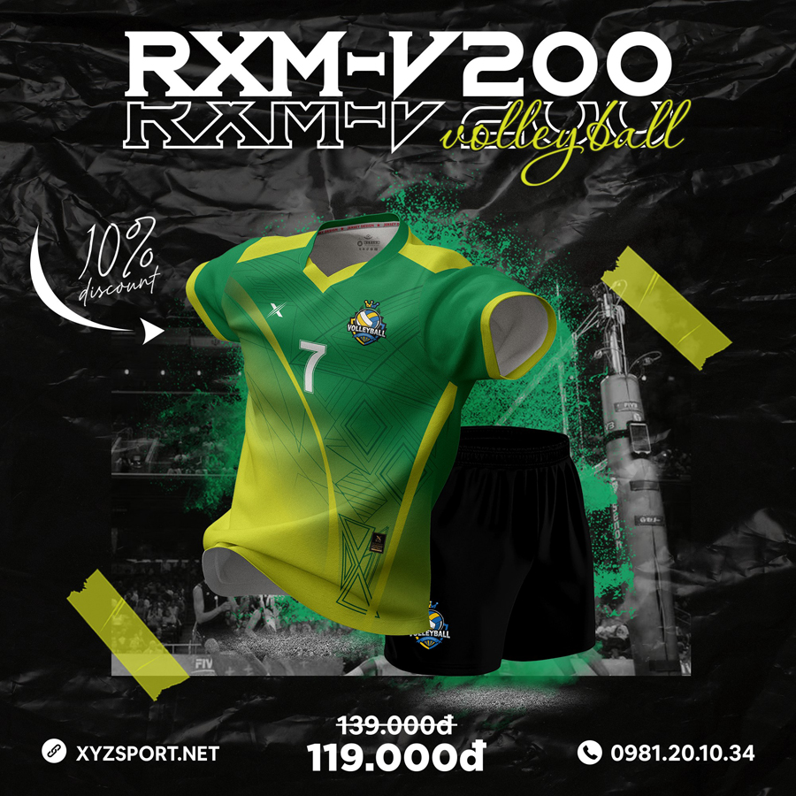 Áo thể thao RXM-V200 phiên bản màu xanh lá kết hợp vàng – thiết kế hiện đại, chất liệu thể thao chuyên dụng, thoáng khí, phù hợp cho thi đấu và luyện tập chuyên nghiệp.