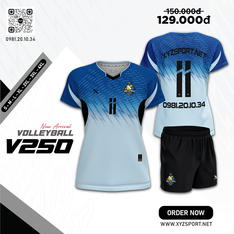 Mẫu đồng phục bóng chuyền V250 được XYZ Sport thiết kế dành riêng cho các đội thể thao yêu thích phong cách mạnh mẽ, cá tính nhưng vẫn giữ được sự linh hoạt. Gam màu xanh dương đậm – xanh nhạt theo xu hướng chuyển sắc (gradient) tạo nên hiệu ứng thị giác mát mẻ và chuyên nghiệp. Điểm nhấn màu đen ở hai bên hông áo không chỉ giúp thon gọn vóc dáng mà còn tạo dựng phong cách hiện đại, dứt khoát.