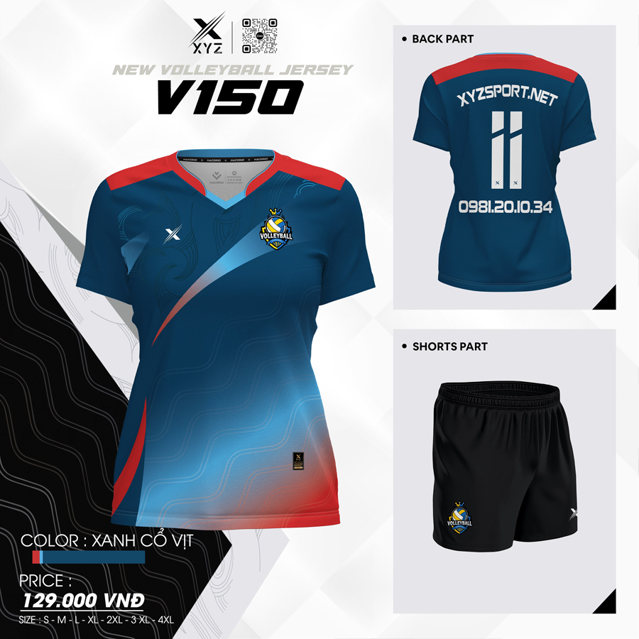 Áo bóng chuyền V150 – phối màu xanh cổ vịt hiện đại, họa tiết ombre trẻ trung, chất liệu thể thao thoáng mát, thiết kế mạnh mẽ cho những trận đấu đỉnh cao.